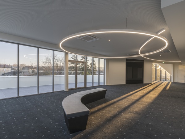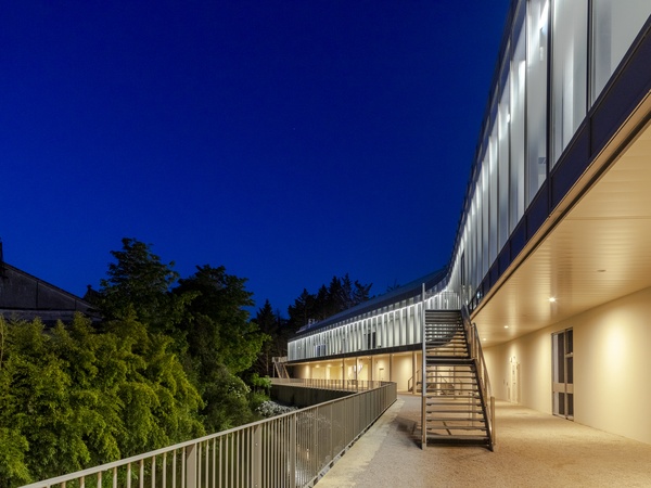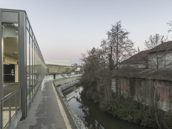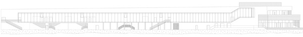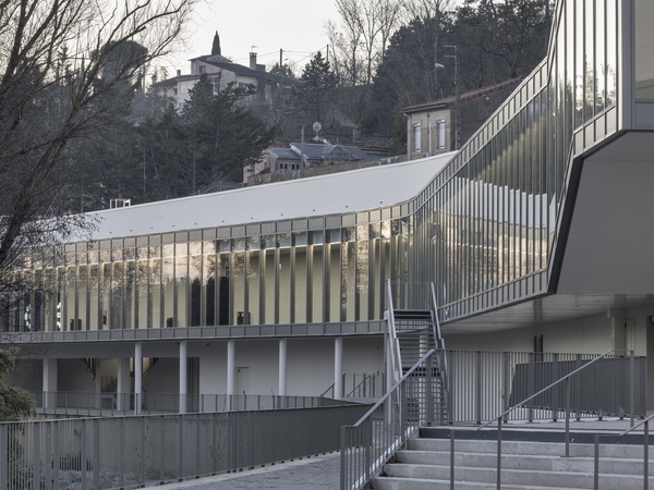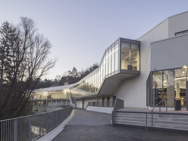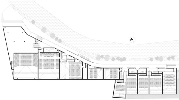 Le volume général est travaillé de manière à ce que l’impact de la façade sur l’espace public soit minimisé. Le hall en premier plan à l’angle nord-ouest est couvert par la terrasse qui permet de reculer la façade du déambulatoire haut. Le déambulatoire, dont la couverture est plus basse que celle de la grande salle permet, de la même manière, de mettre en recul le volume plus haut de cette dernière. Ce travail de «gradinage» permet de réduire l’impact visuel sur l’espace public du volume du projet en accompagnant la pente du chemin des Porches.