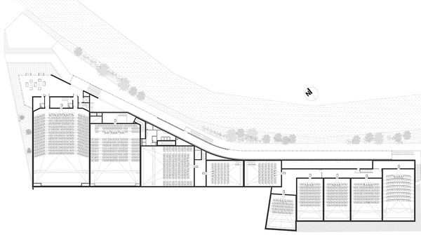 Le projet dont l’accès est prévu par un parvis sur le pont des Soldats vient s’implanter entre la Durenque et le Chemin du Salinal. Le site étant en forte pente, la partie sud du bâtiment sera enterrée, le niveau de la toiture de la partie sud du bâtiment sera en-dessous du Chemin du Salinal. Cela permet d’implanter les salles de cinéma sur cette partie de la parcelle et d’exposer le déambulatoire au nord de la parcelle, le long de la rivière. Cette implantation permet au projet de se déployer côté rivière et de garantir un éclairage naturel généreux du hall et du déambulatoire tout en créant une promenade le long de la Durenque.