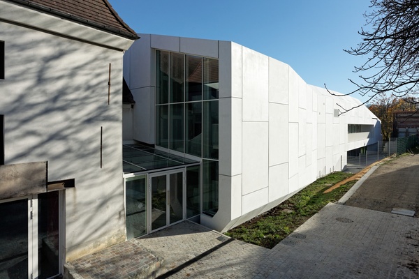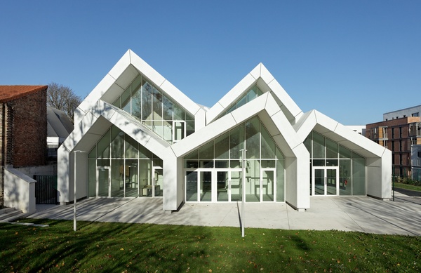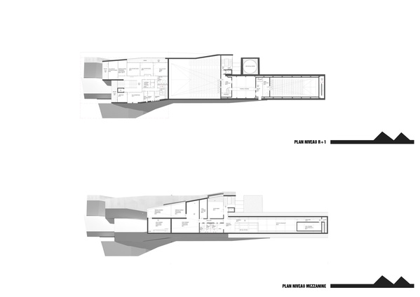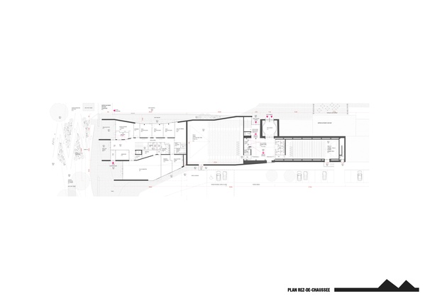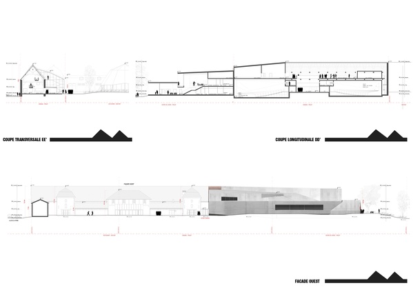 Ce corps greffé se présente sous forme d’un monolithe en béton teinté inspiré des tuiles et briques des existants. Sa forme nait de la continuité formelle du pignon de la ferme existante et plus largement des pignons des architectures environnantes anciennes ou modernes.Plus notre projet s’éloigne des points de coutures, de liaison, plus sa forme se libère et se tend comme les doigts d’une main vers le parc ouvert au Sud Est du site...