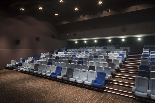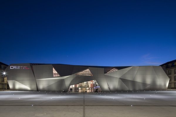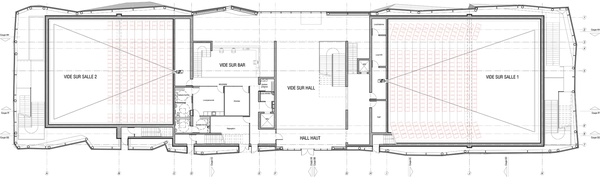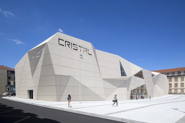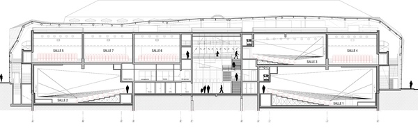 Le revêtement de la place devient vêtement du bâtiment, dans un dispositif de double peau qui laisse une grande liberté d’expression plastique tout en renforçant les qualités d’isolation et de barrière aux surchauffes du complexe cinématographique. Cette peau, pleine au droit des volumes de salles, se fait transparente au droit du Hall et du déambulatoire d’accès aux salles hautes. L’accueil et la circulation du public se font donc à la lumière naturelle, avec des vues cadrées sur le Grand paysage, la Place, le bâtiment de l’Horloge, l’horloge elle-même…