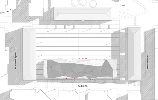 Nous avons donc choisi de compléter la définition des contours de la Place par l’implantation d’un quatrième corps de bâtiment lui aussi monolithique, le cinéma, de fonctionnement compact sur deux niveaux, aligné sur la rue, de hauteur dialoguant avec celle des corps de bâtiment existants, d’emprise au sol réduite, restituant une place ample et lisible offrant une grande flexibilité d’accueil aux évènements et notamment au festival international de théâtre de rue.