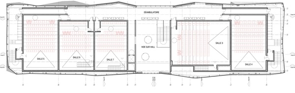Afin d’assurer la perméabilité d’accès à la Place la rue Caylus est prolongée, devenant rue intérieure au projet, jusqu’à la Place de la Paix. Un jeu de niveaux permet d’assurer une fonction traversante du Hall sans nuire au contrôle des billets nécessaire au programme.Les édifices voués au spectacle s'étant exprimés de tout temps dans la Ville de façon singulière et festive, nous avons travaillé l’expression du projet à partir de la notion de mouvement, inhérente au cinéma, dans une architecture saisissant le déploiement d’un cristal né de la Place, vibration de facettes jouant avec l’éclairage diurne ou nocturne, dans un mouvement continu d’ombres et de lumière.