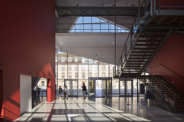 Le traitement de la Place, principalement minéral en accord avec l‘histoire du site, se fait de façades à façades en distinguant d’une part les zones de circulation et d’autre part un espace vaste, simple et libre de recevoir tout type d’évènement, central, protégé, innervé d'un maillage de boîtiers fluides, entièrement piétonnier. Le point restauration s’ouvre sur ce parvis avec une terrasse bien exposée.