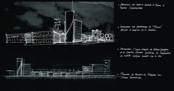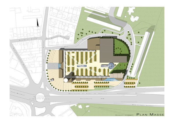 La conception du projet joue sur les trois échelles temporelles de perception du site: l'une, rapide, vécue depuis le boulevard périurbain au sud, une seconde perception à l'Ouest, plus urbaine et d'usage, vécue depuis le boulevard Pinel et ses transports en commun, et enfin la perception quotidienne vécue par les logements situés au Nord et à l'Est du programme.Le fonctionnement commercial s'appuie sur un parcours piéton protégé ludique, d'Est en Ouest, irrigant essentiellement des moyennes unités commerciales ponctuées de zones de restauration et de divertissement sous une coupole faisant écho à la célèbre coupole du boulevard Haussmann.