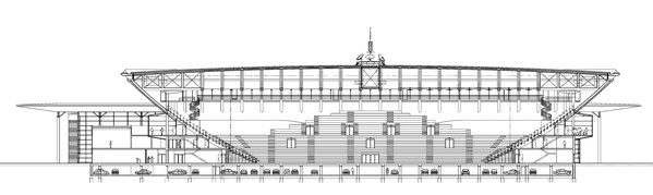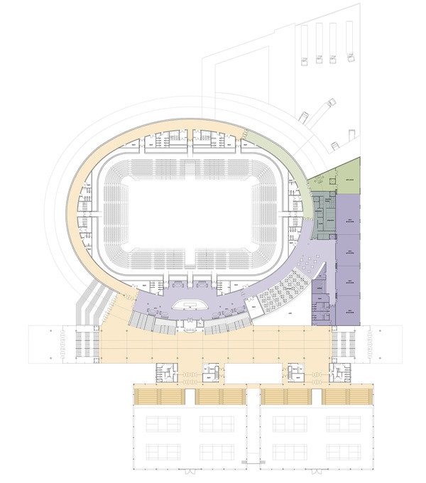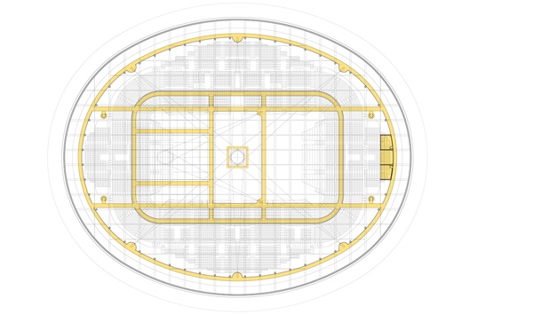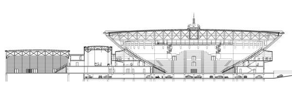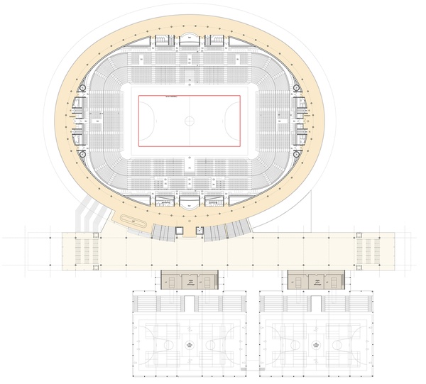 La composition de masse s’appuie sur la lisibilité des volumes des deux salles, en greffe sur la colonne vertébrale que constitue le Hall du GEP. Elle s’appuie également sur les lignes de force du bâti du Parc des Expositions, immédiatement voisin et fonctionnant en synergie.L’arène de la grande salle génère une volumétrie spectaculaire, soulignée par l’anneau lumineux du déambulatoire haut. Cet événement architectural participe avec le hall d’accueil au signal du programme dans l’environnement.