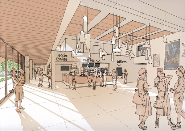 Le hall, le déambulatoire et le ciné-café s’organisent donc à l’Est et au Sud et accompagnent les nouvelles liaisons douces du site. Le hall, à l’Est, est largement ouvert sur le parvis, en belvédère sur le port. Conçu comme un prolongement intérieur du parvis, il est en double hauteur et dessert tous les espaces du cinéma. Espace très modulaire il saura s’adapter aux nouveaux usages contemporains. L’espace ciné-café tourné vers le paysage offre un espace plus paisible, à l’abri des flux du cinéma, tout en maintenant des liaisons visuelles sur le hall. Dans la continuité du hall, le déambulatoire se développe en creux le long de la façade sud. Telle une vitrine, il s’ouvre sur une promenade haute reconnectant la rue de la fraternité au parvis. La faille ainsi créée laisse l’espace public se glisser sous le bâtiment et protège le déambulatoire des apports solaires.