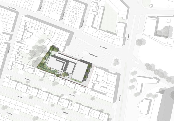 dans son contexte ; la couleur noire distingue l’équipement des habitations de brique rouge qui le bordent.