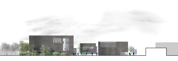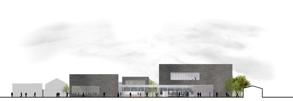 L’expression formelle est simple ; trois volumes correspondent aux trois éléments du programme : la salle festive, la salle de répétition, le cinéma. Le choix de la brique noire comme matériau unique fait ressortir cette pureté des volumes. Sa teinte se décline sur une large palette chromatique allant du gris moyen au gris anthracite, avec des marbrures blanches et des reflets cuivrés. Elle ancre le bâtiment