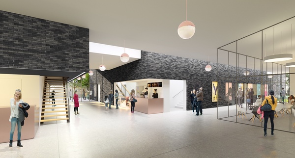 Le hall est l’élément central du projet, l’endroit où tous les publics se croisent, son Agora. Il se déploie en T au cœur du complexe, entre les trois programmes qu’il irrigue. Bien qu’étant le lieu unique de distribution, il permet la séparation des flux propres à chaque espace.