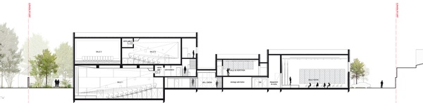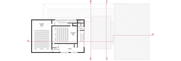 La salle festive est accessible directement depuis le hall, où un espace de billetterie/vestiaire/bar lui est dédié. La salle de répétition se situe au centre du complexe, et semble suspendue.