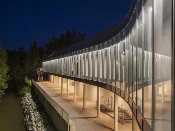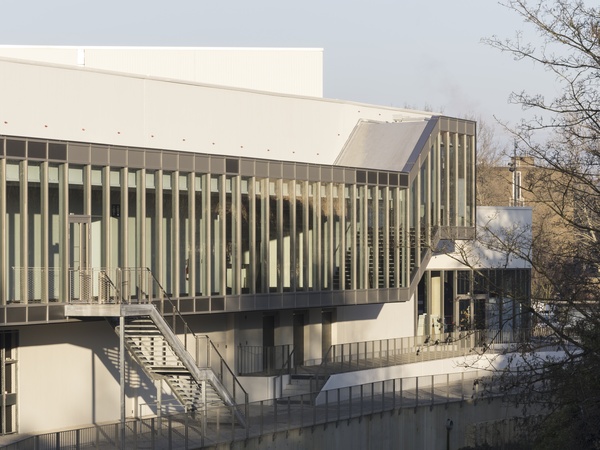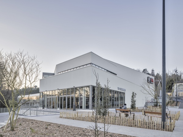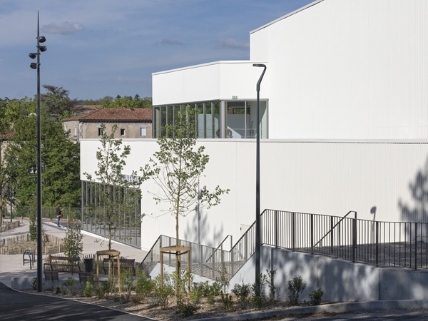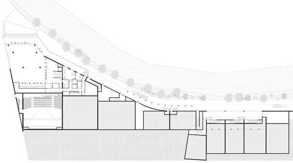 Le volume général est travaillé de manière à ce que l’impact de la façade sur l’espace public soit minimisé. Le hall en premier plan à l’angle nord-ouest est couvert par la terrasse qui permet de reculer la façade du déambulatoire haut. Le déambulatoire, dont la couverture est plus basse que celle de la grande salle permet, de la même manière, de mettre en recul le volume plus haut de cette dernière. Ce travail de «gradinage» permet de réduire l’impact visuel sur l’espace public du volume du projet en accompagnant la pente du chemin des Porches.