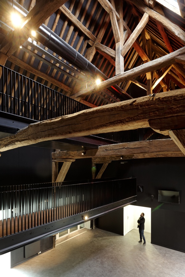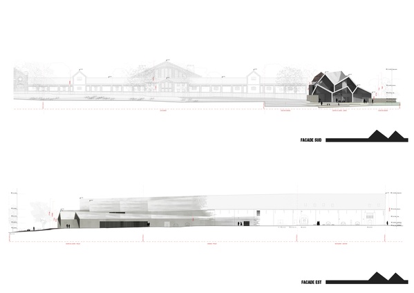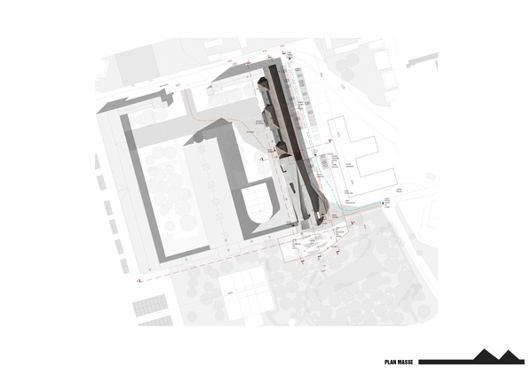 Ce corps greffé se présente sous forme d’un monolithe en béton teinté inspiré des tuiles et briques des existants. Sa forme nait de la continuité formelle du pignon de la ferme existante et plus largement des pignons des architectures environnantes anciennes ou modernes.Plus notre projet s’éloigne des points de coutures, de liaison, plus sa forme se libère et se tend comme les doigts d’une main vers le parc ouvert au Sud Est du site...