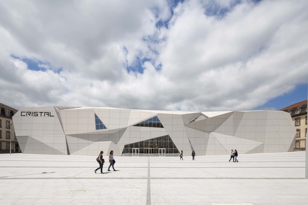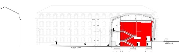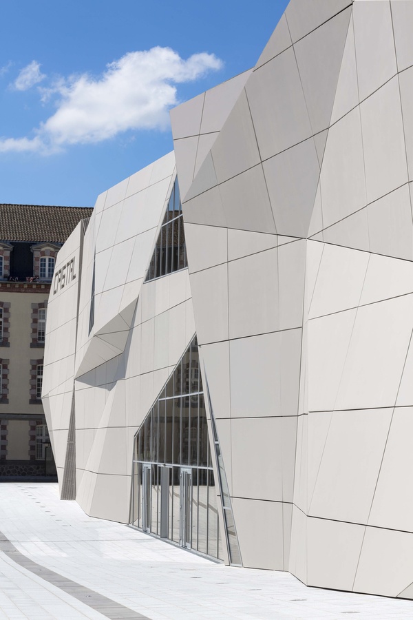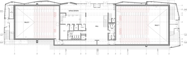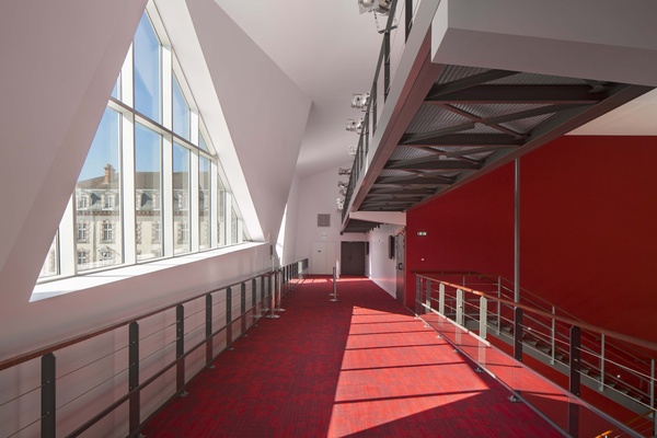 Le revêtement de la place devient vêtement du bâtiment, dans un dispositif de double peau qui laisse une grande liberté d’expression plastique tout en renforçant les qualités d’isolation et de barrière aux surchauffes du complexe cinématographique. Cette peau, pleine au droit des volumes de salles, se fait transparente au droit du Hall et du déambulatoire d’accès aux salles hautes. L’accueil et la circulation du public se font donc à la lumière naturelle, avec des vues cadrées sur le Grand paysage, la Place, le bâtiment de l’Horloge, l’horloge elle-même…