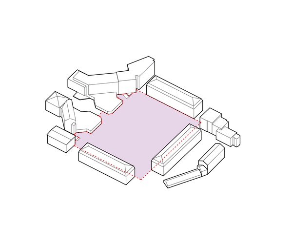 Nous avons donc choisi de compléter la définition des contours de la Place par l’implantation d’un quatrième corps de bâtiment lui aussi monolithique, le cinéma, de fonctionnement compact sur deux niveaux, aligné sur la rue, de hauteur dialoguant avec celle des corps de bâtiment existants, d’emprise au sol réduite, restituant une place ample et lisible offrant une grande flexibilité d’accueil aux évènements et notamment au festival international de théâtre de rue.