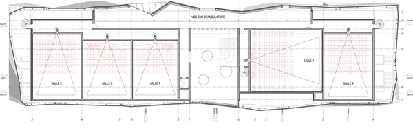 Afin d’assurer la perméabilité d’accès à la Place la rue Caylus est prolongée, devenant rue intérieure au projet, jusqu’à la Place de la Paix. Un jeu de niveaux permet d’assurer une fonction traversante du Hall sans nuire au contrôle des billets nécessaire au programme.Les édifices voués au spectacle s'étant exprimés de tout temps dans la Ville de façon singulière et festive, nous avons travaillé l’expression du projet à partir de la notion de mouvement, inhérente au cinéma, dans une architecture saisissant le déploiement d’un cristal né de la Place, vibration de facettes jouant avec l’éclairage diurne ou nocturne, dans un mouvement continu d’ombres et de lumière.