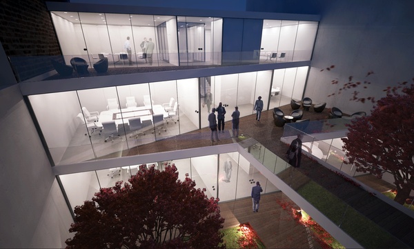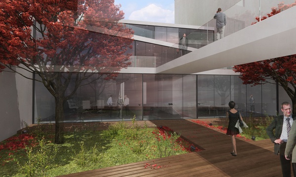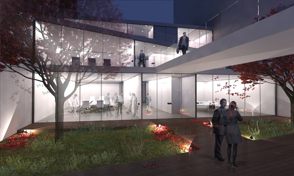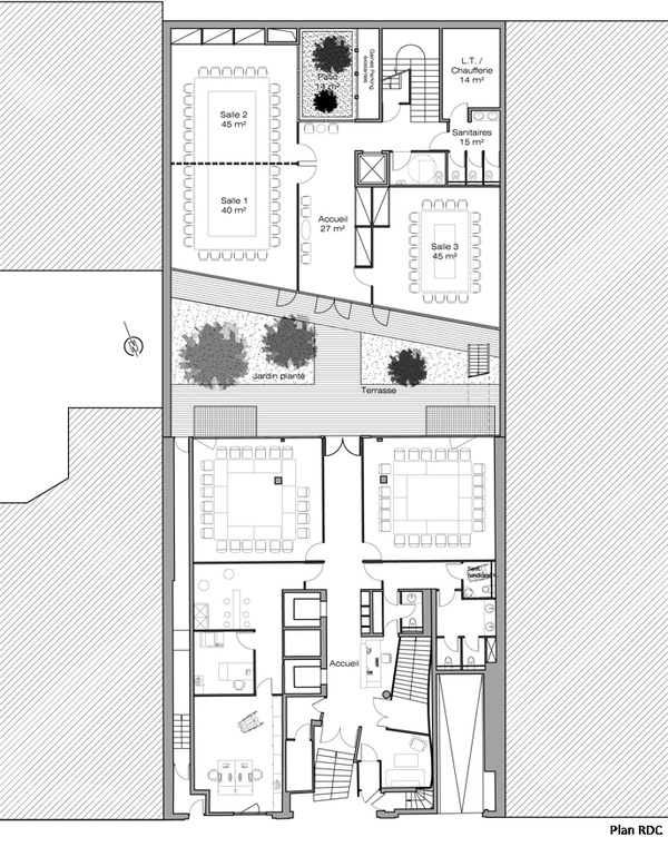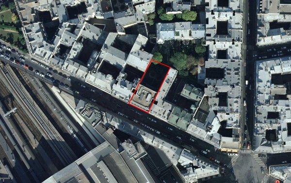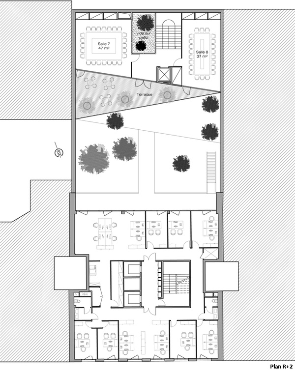 Le bâtiment existant est d'une architecture monolithique et d'un vocabulaire simple, le tout créant un ensemble statique. L'arrivée du nouveau programme nous a poussé à créer une dynamique nouvelle dans le site. Cette dynamique, induite par de simples mouvements de façades, nous a permis d'atteindre plusieurs buts : avoir un rapport moins frontal avec l'existant tout en créant des terrasses généreuses, préserver des largeurs importantes entre les deux bâtis et éviter les jours de souffrance des bâtiments mitoyens.Depuis l'accueil de l'immeuble existant, un axe transparent dessert à travers le jardin, à couvert, le bâtiment qui se développe sur trois niveaux autour d'une circulation verticale centrale et lumineuse.