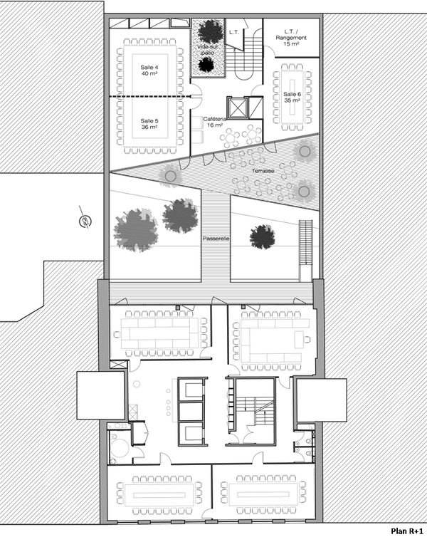 La cafétéria, située au premier étage, s'ouvre sur une terrasse en liaison directe avec le premier étage du bâtiment existant