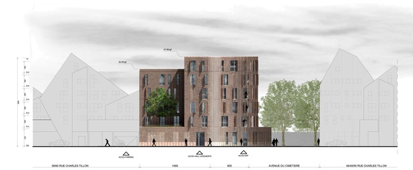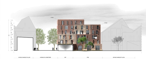 Afin de permettre au bâtiment d'affirmer sa présence dans le contexte environnant et de renforcer le dégagement sur l’avenue du cimetière, nous avons marqué l’angle au croisement de la rue Charles Tillon et de l’avenue du Cimetière.Le volume créé en mitoyenneté du 58 rue Charles Tillon reprend les reculs et la hauteur moyenne du bâtiment voisin créant ainsi une accroche cohérente. La partie sud, face au 50 rue Charles Tillon, reprend l’alignement et la hauteur maximale, créant ainsi un rapport de masse et de volume cohérent.