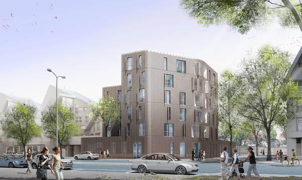 Un important recul sur le cimetière permet de s’ouvrir au maximum sur l’espace végétalisé et arboré en Rez de chaussée du projet. Ce recul, combiné avec les plis de la façade, génère une plus grande ouverture vers le sud-est pour un meilleur ensoleillement des terrasses des logements.