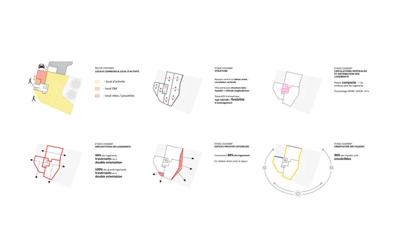 Le bâtiment s’intègre aux masses construites existantes mais existe aussi par lui-même, grâce à la matérialité de sa façade et les usages qui en résultent. Le principe des panneaux métalliques (inox perforé ou embouti en fonction des zones de la façade) ouverts ou fermés rend le bâtiment vivant;