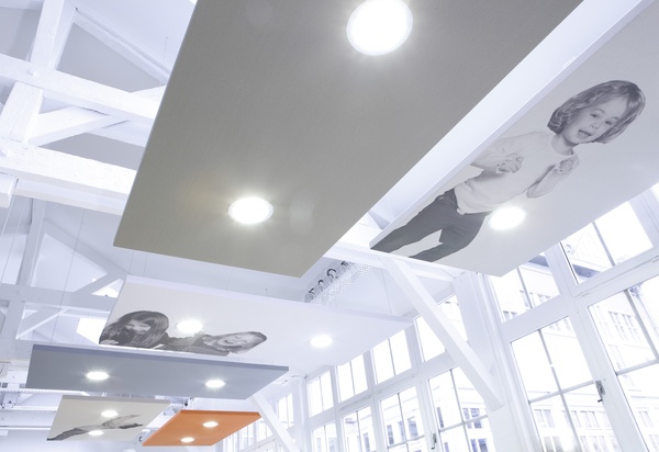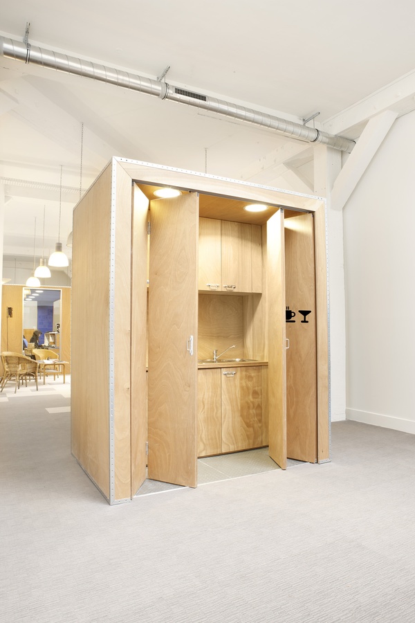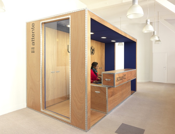 La flexibilité des lieux est importante, à la fois sur le plan géométrique et sur le plan des équipements disponibles, puisque l'effectif de base peut passer de 70 (membres du personnel permanent) jusqu'à 170 personnes lorsque bénévoles, visiteurs et participants à des formations sont tous présents.Le dessin du projet intègre deux éléments forts de l'identité de l'UNICEF: les enfants, et le fret des aides d'urgence. Suspendus au dessus des postes de travail, de grands portraits d'enfants ont été imprimés sur des panneaux acoustiques qui participent également aux dispositifs d'éclairage et de distribution fluide des locaux. Le mobilier spécifique destiné aux salles de réunions, à l’accueil et à la cafétéria, s'inspire du conditionnement des caisses expédiées pour l'aide aux enfants du monde.