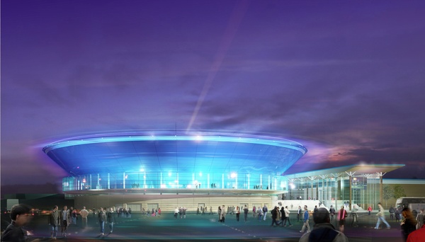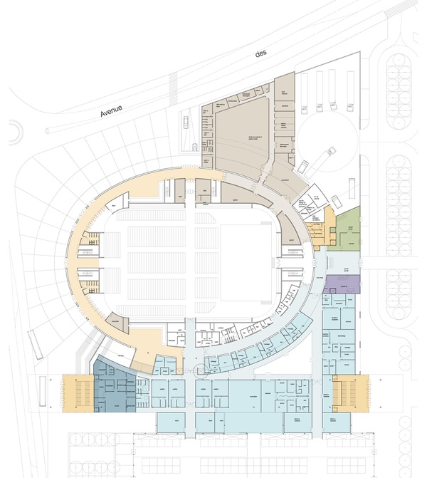 La composition de masse s’appuie sur la lisibilité des volumes des deux salles, en greffe sur la colonne vertébrale que constitue le Hall du GEP. Elle s’appuie également sur les lignes de force du bâti du Parc des Expositions, immédiatement voisin et fonctionnant en synergie.L’arène de la grande salle génère une volumétrie spectaculaire, soulignée par l’anneau lumineux du déambulatoire haut. Cet événement architectural participe avec le hall d’accueil au signal du programme dans l’environnement.