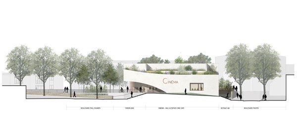 Les volumes bâtis sont sculptés, articulés, et s’entremêlent aux strates végétales, faisant du cinéma, habituellement vu comme un bâtiment massif et opaque, un équipement perméable et ouvert sur la ville. S’implantant d’Ouest en Est, le long du boulevard Pasteur, le bâtiment s’étire du centre-ville vers le port. Le volume descend progressivement suivant les gabarits des bâtiments environnant et la topographie du site. Les salles sont ainsi rassemblées en un volume compact, à l’angle Nord-Ouest, autour duquel s’articulent les espaces de convivialité du cinéma. Les deux volumes ainsi imbriqués, glissent l’un dans l’autre, le plus haut descendant vers le hall, qui lui-même se soulève légèrement à l’Est pour signaler l’entrée du bâtiment. Un système de toitures fortement végétalisées s’organisent entre ces deux volumes. Cette importante strate végétale souligne les jeux d’acrotères montantes et descendantes faisant écho aux structures bocagères et aux murets en pierre existant.