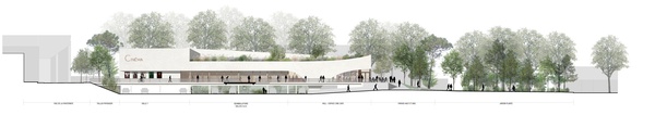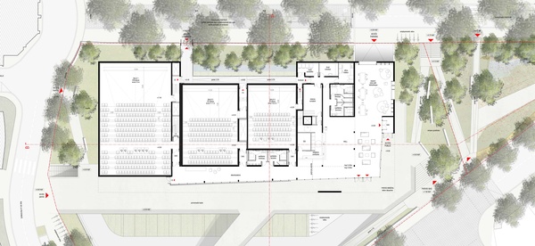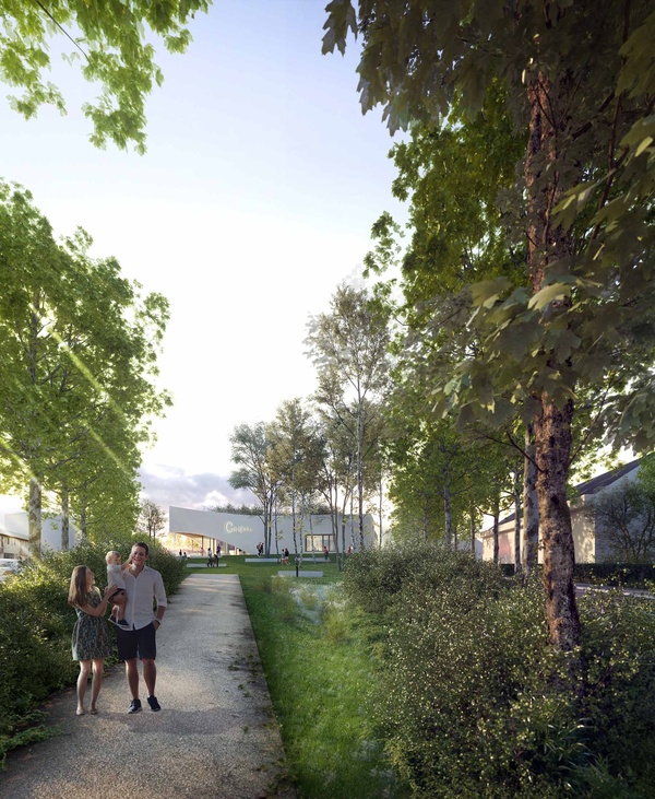Le futur cinéma de Nort-sur-Erdre propose de multiples ouvertures et connections avec son environnement proche, venant renouer le site avec son territoire. Le projet paysager accompagne son insertion urbaine, intégrant le bâtiment dans un écrin de verdure.