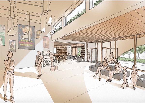 Le hall, le déambulatoire et le ciné-café s’organisent donc à l’Est et au Sud et accompagnent les nouvelles liaisons douces du site. Le hall, à l’Est, est largement ouvert sur le parvis, en belvédère sur le port. Conçu comme un prolongement intérieur du parvis, il est en double hauteur et dessert tous les espaces du cinéma. Espace très modulaire il saura s’adapter aux nouveaux usages contemporains. L’espace ciné-café tourné vers le paysage offre un espace plus paisible, à l’abri des flux du cinéma, tout en maintenant des liaisons visuelles sur le hall. Dans la continuité du hall, le déambulatoire se développe en creux le long de la façade sud. Telle une vitrine, il s’ouvre sur une promenade haute reconnectant la rue de la fraternité au parvis. La faille ainsi créée laisse l’espace public se glisser sous le bâtiment et protège le déambulatoire des apports solaires.