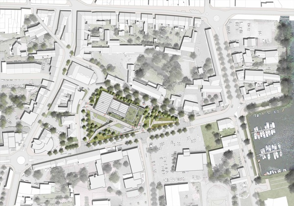 Aujourd’hui, le projet de création d’un nouveau cinéma s’intègre dans une réflexion large, et endosse un rôle majeur dans la vie de la cité. Vecteur de mixité, en s’implantant à l’interface des polarités principales de Nort-sur-Erdre, sur la place Général de Gaulle, il en accompagnera son renouvellement urbain. En plus de valoriser l’offre culturelle de la ville, il se doit donc d’être pensé comme un bâtiment associé à un espace public ouvert où divers manifestations peuvent se dérouler. Entre ville et rivière, le projet paysager, associé au cinéma, travaillera la fusion entre les structures végétales urbaines et celles plus naturelles du corridor rivulaire de l’Erdre.