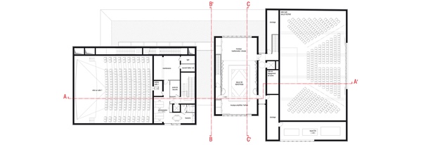 La salle festive est accessible directement depuis le hall, où un espace de billetterie/vestiaire/bar lui est dédié. La salle de répétition se situe au centre du complexe, et semble suspendue.