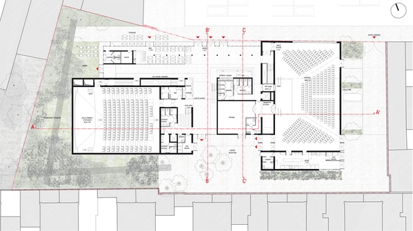 Le hall est l’élément central du projet, l’endroit où tous les publics se croisent, son Agora. Il se déploie en T au cœur du complexe, entre les trois programmes qu’il irrigue. Bien qu’étant le lieu unique de distribution, il permet la séparation des flux propres à chaque espace.
