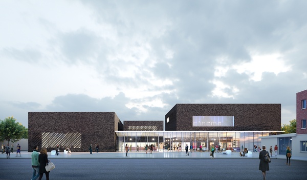 L’expression formelle est simple ; trois volumes correspondent aux trois éléments du programme : la salle festive, la salle de répétition, le cinéma. Le choix de la brique noire comme matériau unique fait ressortir cette pureté des volumes. Sa teinte se décline sur une large palette chromatique allant du gris moyen au gris anthracite, avec des marbrures blanches et des reflets cuivrés. Elle ancre le bâtiment