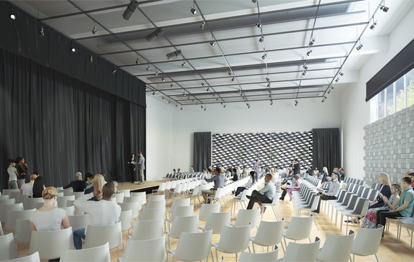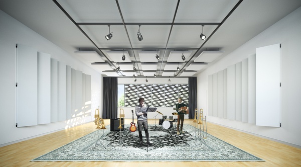 Un tapis persan habille le sol de la salle de répétition, à la fois pour compléter le dispositif acoustique et pour rendre le lieu plus chaleureux. Dans les salles de cinéma, les écrans sont courbes, les salles bien gradinées pour permettre un très
